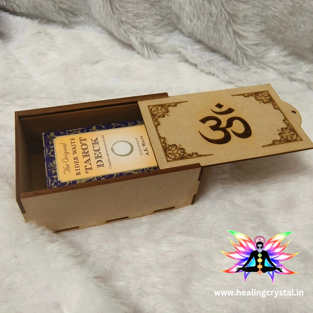 Tarot Cards Storage Box With Engrave Design Om Mantra (Box With Slider) used for Tarot Cards / Crystal Stone / Angel Cards available at Healing Crystal Shop India Created by the renowned Celebrity Astrologer Priyanka Sawant. This Box showcases the beauty of Om Mantra and craftmanship. Box- color & size will vary as its a made of mdf . Our Box piece are hand crafted from mdf. The Storage Box combines style, making it a perfect choice for those seeking elegance and sophistication. its natural beauty lustrous appearance and smooth texture make it a perfect Statue for Decor, Gifting, Prayer. Elevate your style with this Tarot Cards / Crystal Stone / Angel Cards (Box With Slider) that effortlessly combines timeless allure fashion