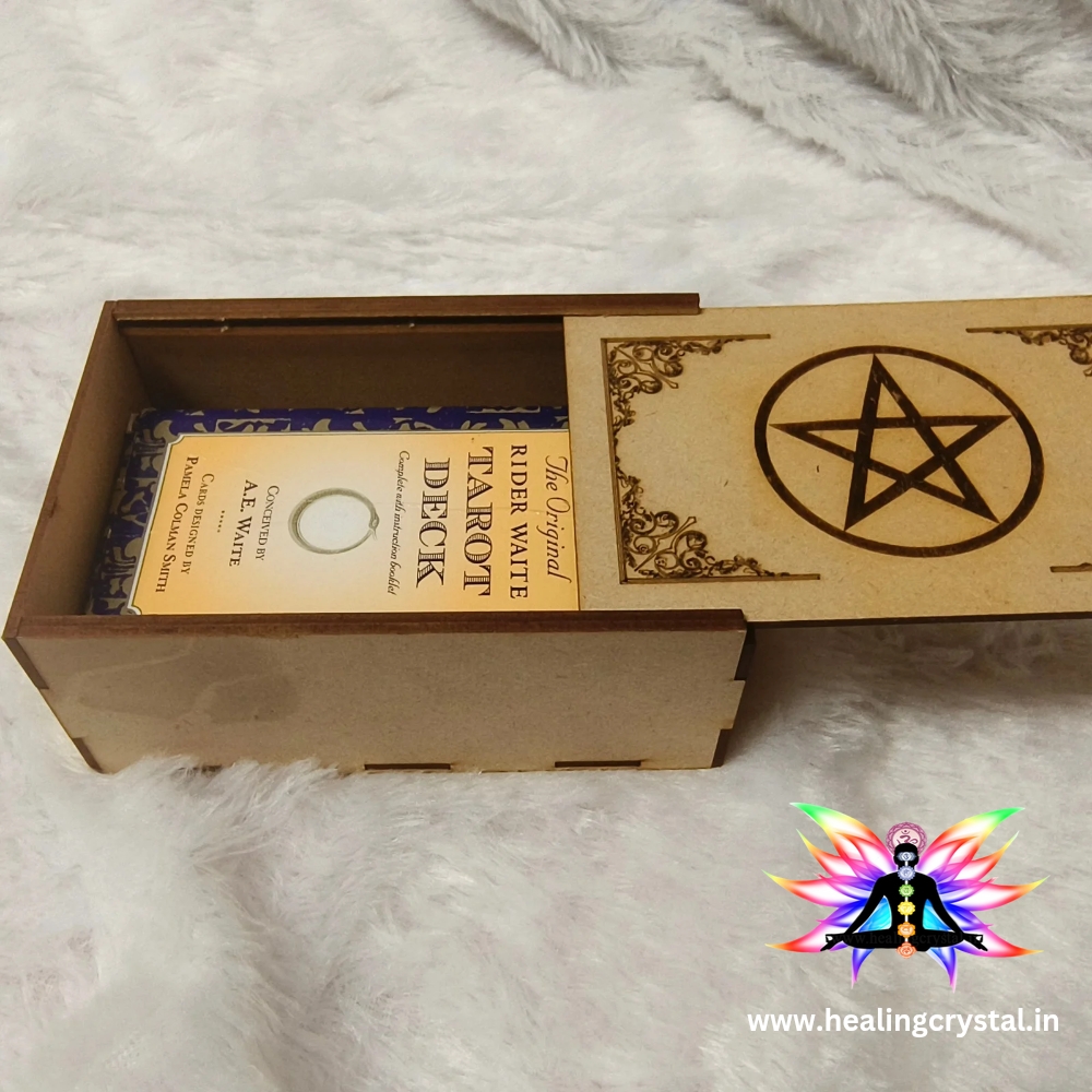 Tarot Cards Storage Box With Engrave Design Pentacle (Box With Slider) used for Tarot Cards / Crystal Stone / Angel Cards available at Healing Crystal Shop India Created by the renowned Celebrity Astrologer Priyanka Sawant. This Box showcases the beauty of Om Mantra and craftmanship. Box- color & size will vary as its a made of mdf . Our Box piece are hand crafted from Mdf. The Storage Box combines style, making it a perfect choice for those seeking elegance and sophistication. its natural beauty lustrous appearance and smooth texture make it a perfect Statue for Decor, Gifting, Prayer. Elevate your style with this Tarot Cards / Crystal Stone / Angel Cards (Box With Slider) that effortlessly combines timeless allure fashion